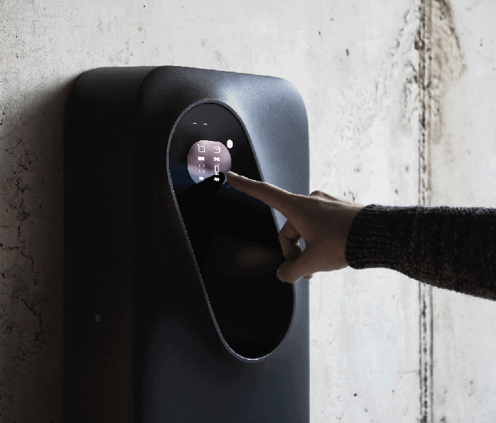 Настенная домашняя зарядная станция INCH Home на 22 кВт. Дизайн устройства выполнен из металла и подойдет к любому интерьеру. Зарядка исполнена в универсальном корпусе для домашней и публичной установки. Устройство имеет информационный монохромный дисплей. Для управления и контроля за ходом зарядки электрокара необходимо установить бесплатное приложение от производителя.
